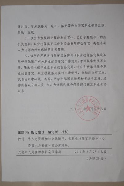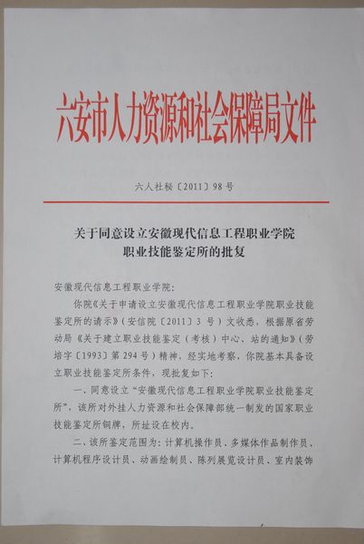 日前,六安市人力资源和社会保障局正式下文,同意beat365设立专业技能鉴定所,对外挂“人力资源和社会保障部统一制发的国家职业技能鉴定所铜牌。