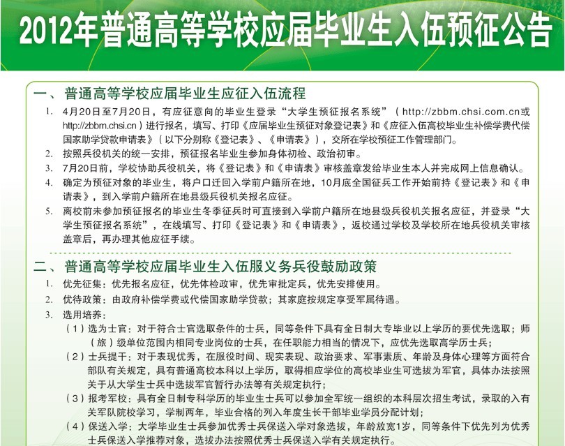2012年普通高等学校应届毕业生入伍预征公告