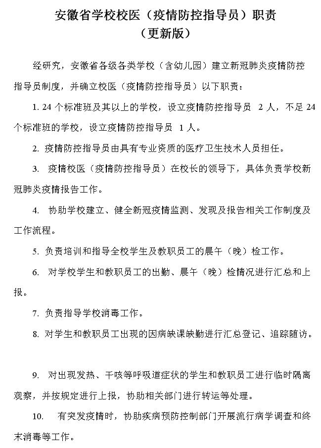 [疫情防控专题]安徽省学校校医(疫情防控指导员)职责(更新版)