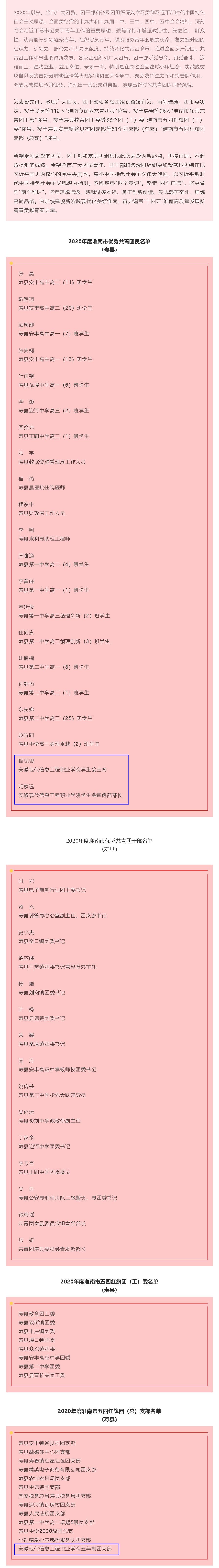 2020年度淮南市(寿县)优秀共青团员名单