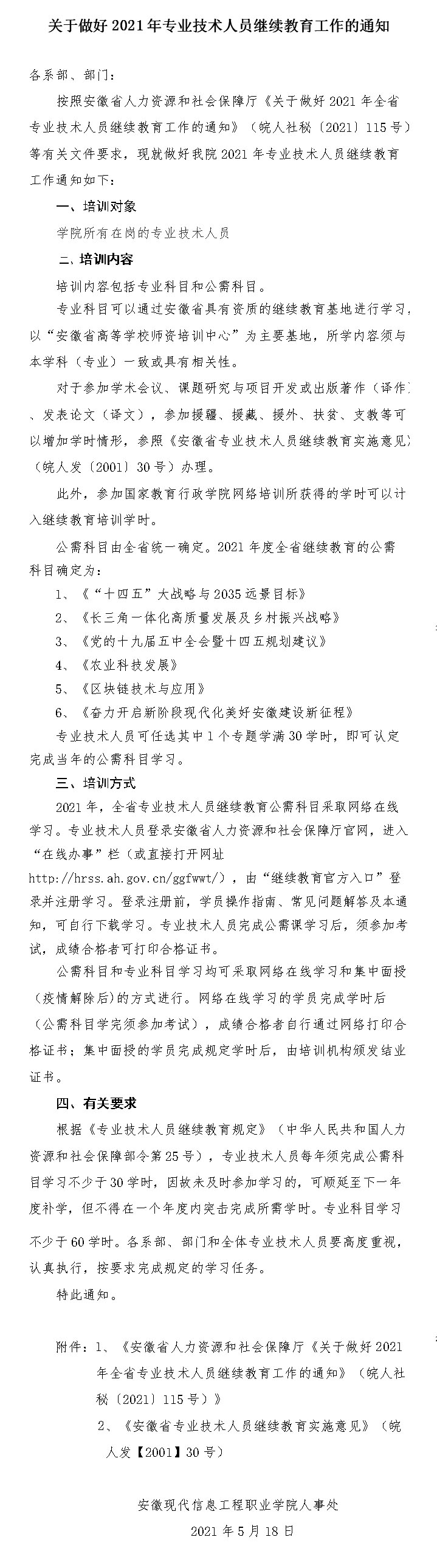 附件1 《安徽省人力资源和社会保障厅《关于做好2021年全省专业技术人员继续教育工作的通知》(皖人社秘〔2021〕115号)》
