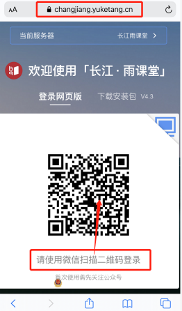 1、手机微信收到长江雨课堂考试通知,用手机浏览器百度搜索:长江雨课堂网页版或者直接访问网址:changjiang.yuketang.cn 进入登录界面,按照网页版的流程进行考试。