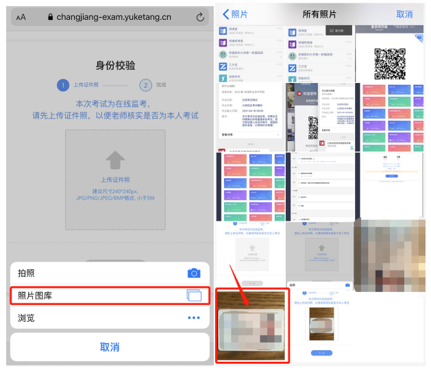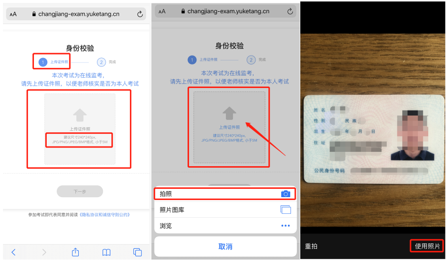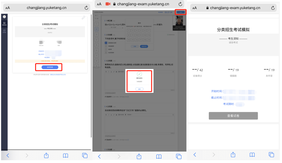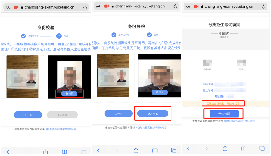 手机浏览器通过访问相机,获取实时的考生人脸信息,点击拍照,进入考试,显示已通过身份效验,即可开始答题。
