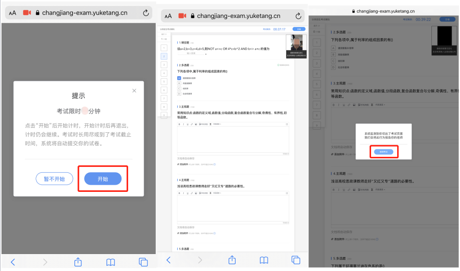 开始答题时,手机摄像头实时监控考生人脸信息,同时系统实时记录考生切换考试屏幕、IP地址变更等作弊嫌疑行为。