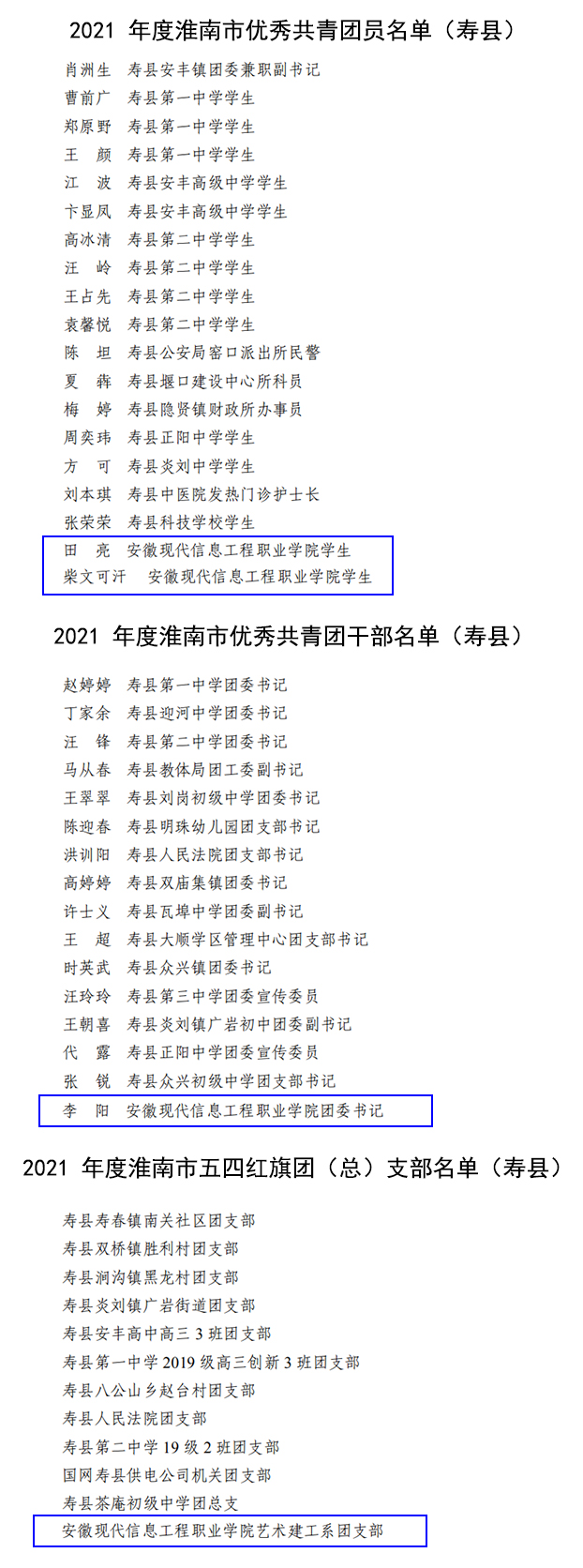 为表彰先进,激励广大团员、团干部和各级团组织奋发有为、 再创佳绩,团市委决定,授予肖洲生等 90 人“淮南市优秀共青团员”称号,授予赵婷婷等 100 人“淮南市优秀共青团干部”称号,授予寿县窑口镇团委等 32 个团(工)委“淮南市五四红旗团(工)委”称号,授予寿县寿春镇南关社区团支部等 54 个团支部(总支)“淮南市五四红旗团支部(总支)”称号。希望受到表彰的团员、团干部和基层团组织以此次表彰为新起点,再接再厉,不断取得新的成绩。