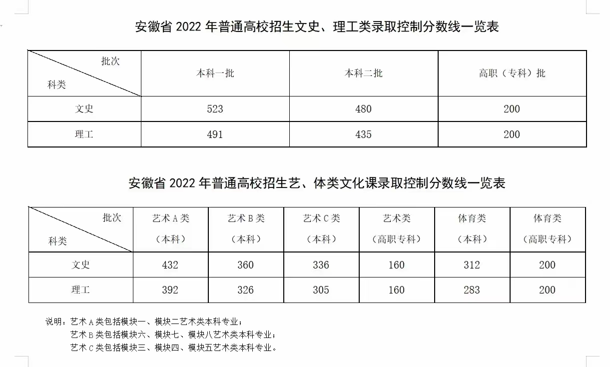 关于公布安徽省2022年普通高校招生录取控制分数线的公告