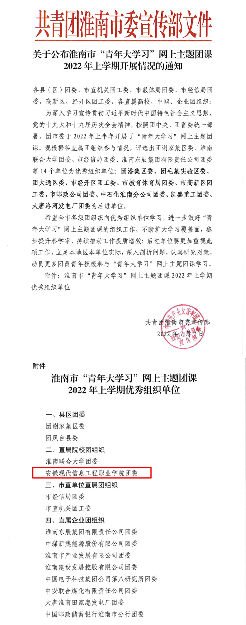 关于公布淮南市“青年大学习”网上主题团课2022年上学期开展情况的通知