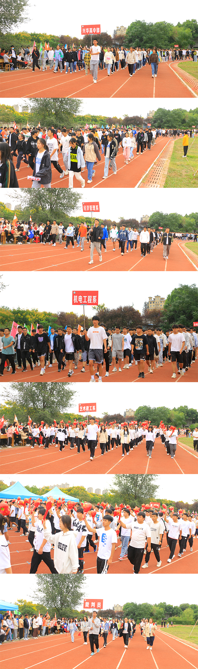 伴随着运动进行曲,各系部运动队伍依次入场。他们个个衣着鲜艳,面带笑容,昂首阔步,展示出青年人特有的朝气与活力。