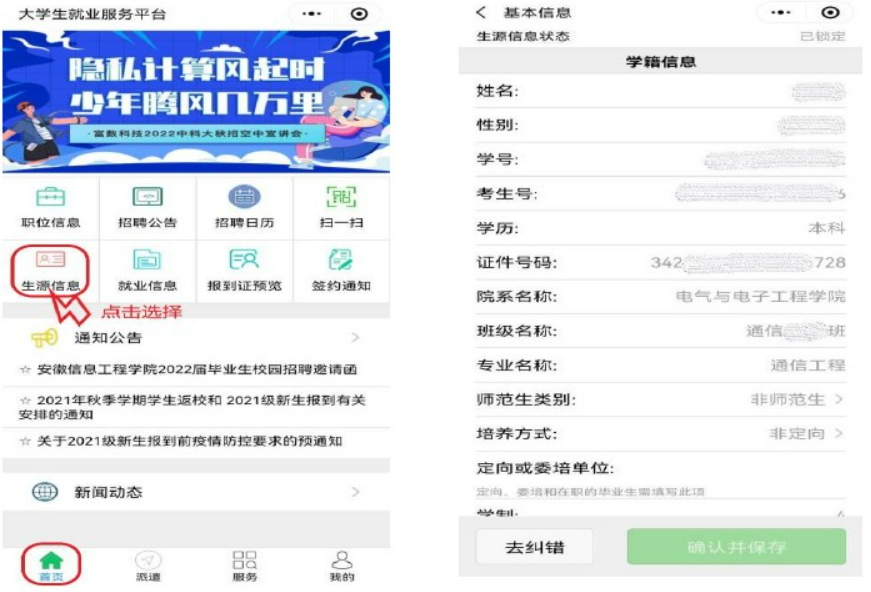 第二步:在平台首面点击【生源信息】对【学籍信息】时行核对,确保信息准确无误。