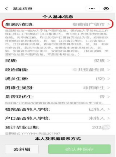 第三步:填写【个人基本信息】中的【生源所在地】(即身份证上所在地,市区生源务必选择到区、县级生源务必选择到县),核对【民族】【政治面貌】等信息,核对无误后点击【确认并保存】。
