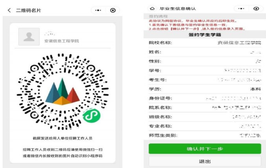 第一步:签约单位工作人员通过微信扫一扫毕业生提供的“二维码”,对签约毕业生信息进行核对确认,点击【确认并下一步】。