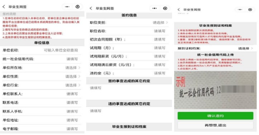 第二步:签约单位工作人员录入【单位信息】】【签约信息】【签约事宜达成的其他约定】【违约事宜达成的其他约定】选择“报到证和档案”的接收方式、上传“统一社会信用代码”,点击【确认邀约】邀请签约毕业生确认完成签约。