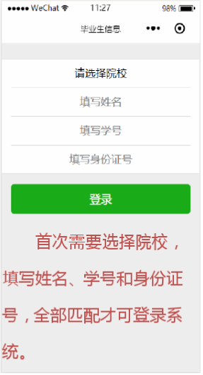 选择院校,输入毕业本人的姓名、学号和身份证号,点击登录进入平台用户主页,如图1-2所示。