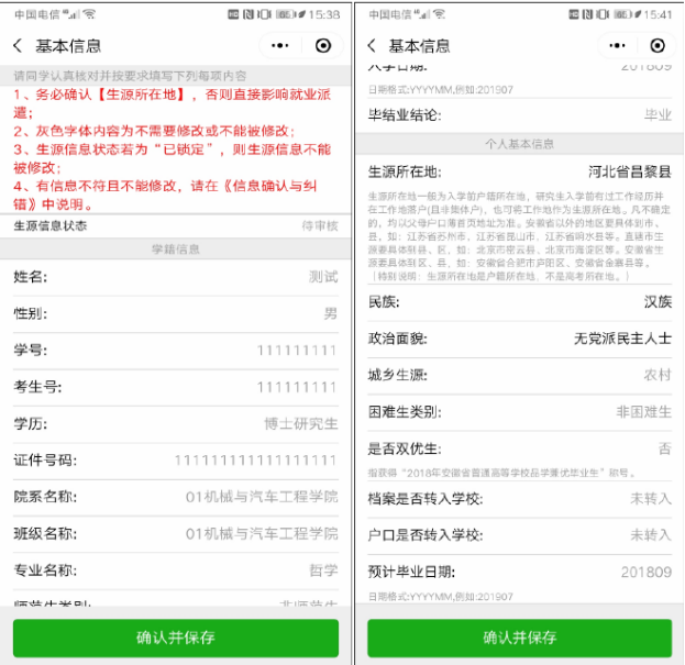 毕业生基本信息包括学籍信息和个人基本信息,其中学籍信息包括姓名、性别、学号、考生号、学历、专业名称、师范生类别、培养方式等,毕业生没有修改权限,但可以核对,若是发现有误报辅导员处修改:个人基本信息包括院系名称、班级名称、生源所在地、证件号码、民族、政治面貌、城乡生源、是否双优生、困难生类别、户口是否转入学校等,其中生源所在地和城乡生源是需要毕业生自己维护的,请按照真实的生源信息维护。