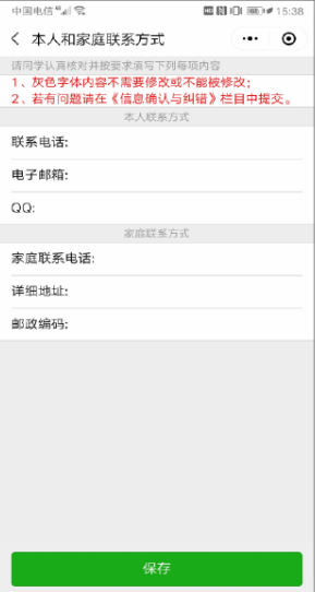 毕业生联系方式包括本人联系方式和家庭联系方式,有联系电话、电子邮件、QQ、详细地址、邮政编码、家庭联系电话等相关信息,每一项信息都需要认真填写,填写完成后,点击图2-2页面下方的“保存”按钮。