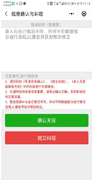 毕业生务必认真核对系统里的基本信息、家庭联系方式信息,若发现有误,请在文本框中填入纠错信息点击“提交纠错”按钮提交,并报辅导员处登记。