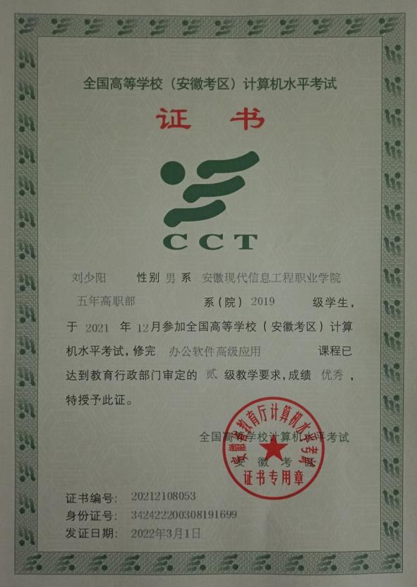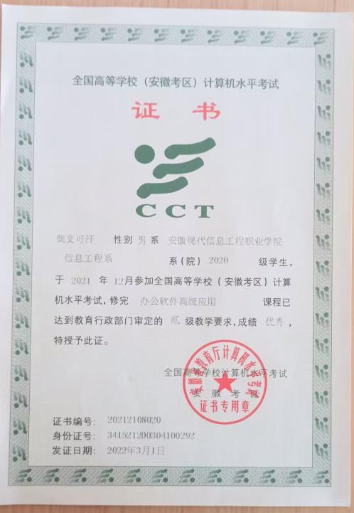 安徽省计算机二级考试优秀证书