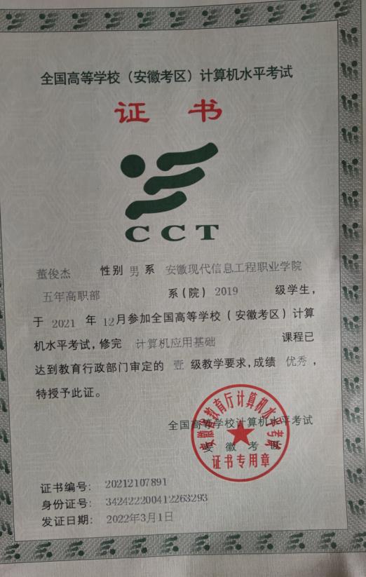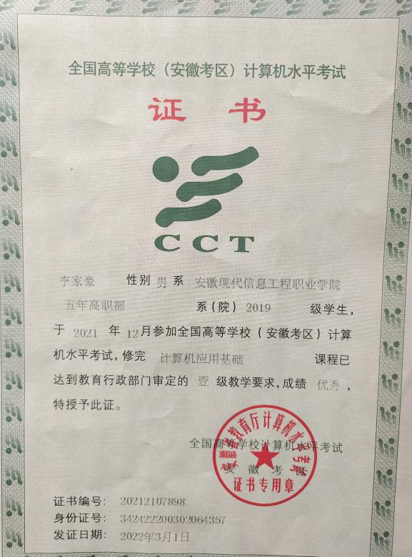 安徽省计算机一级考试优秀证书
