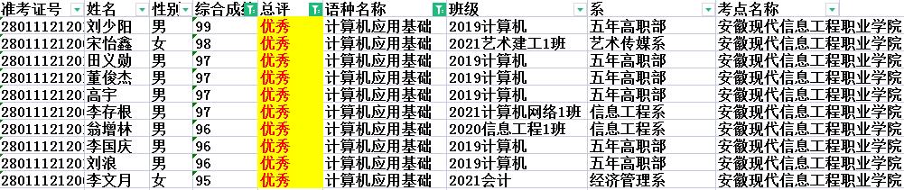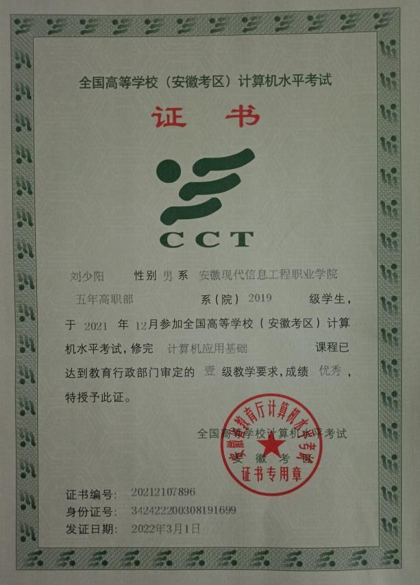 刘少阳同学在2021年安徽省计算机一级考试考取99分,全省第一名