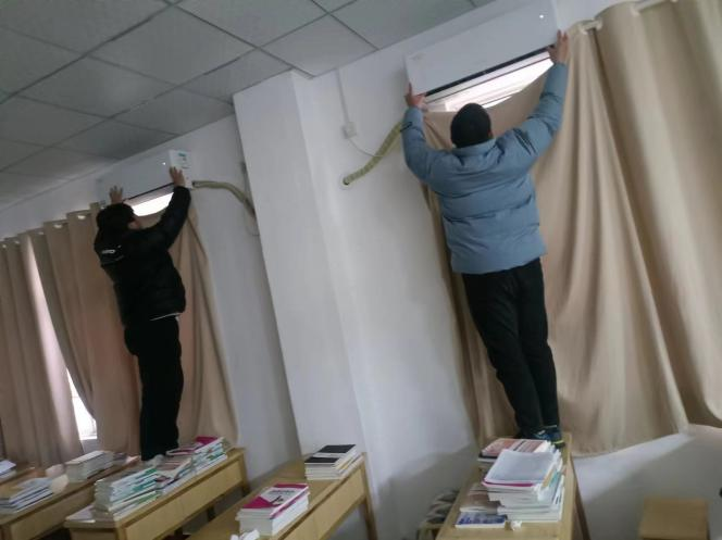 (学生会同学在为教室进行空调清洁)