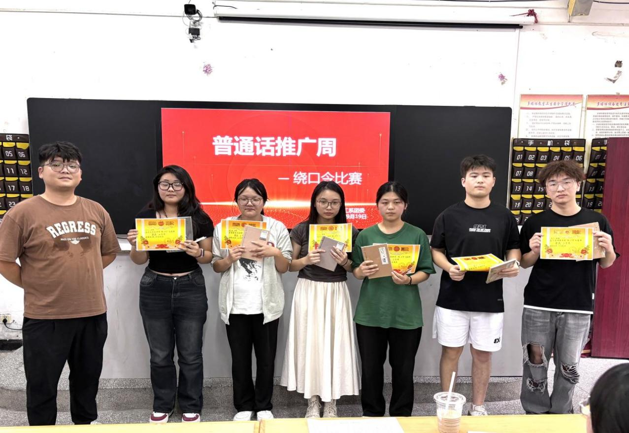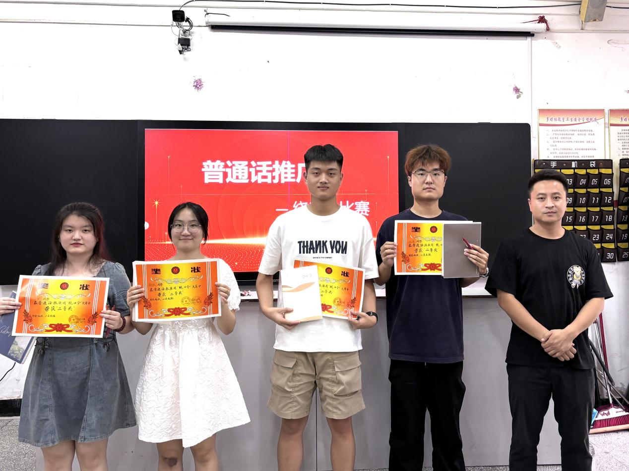 活动开始同学们通过抽签方式决定每队的比赛顺序,在一声声诵读中能够感受到同学们普通话的标准。最后,三位评委评出一等奖1队,二等奖2队,三等奖3队。由系部主任为获奖同学进行颁发证书与奖品。