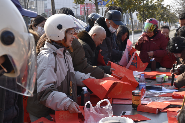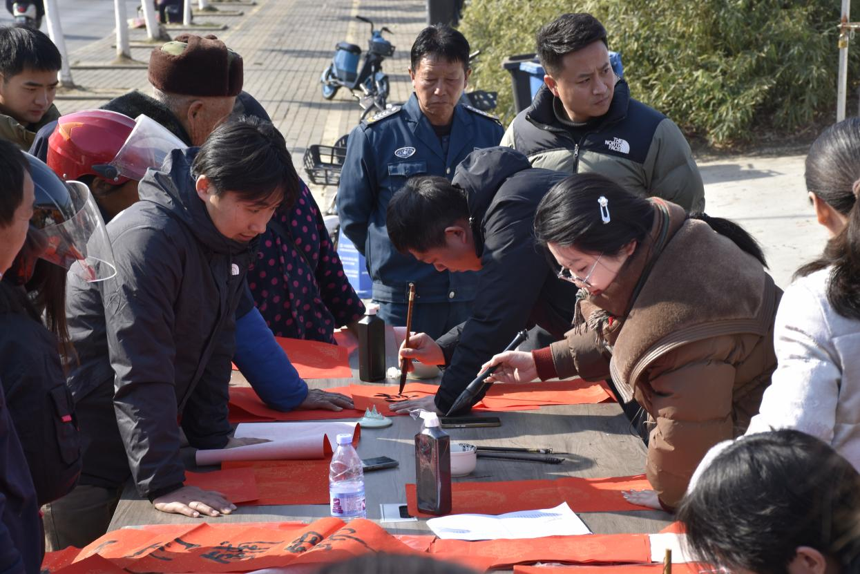 活动现场,学院教师们铺纸研墨,笔走龙蛇,一幅幅寓意吉祥、翰墨飘香的对联跃然纸上。活动通过发布短视频、开直播等方式广泛宣传,不但吸引了众多群众驻足欣赏并领取对联,也为广大群众送上充满年味的新春祝福。