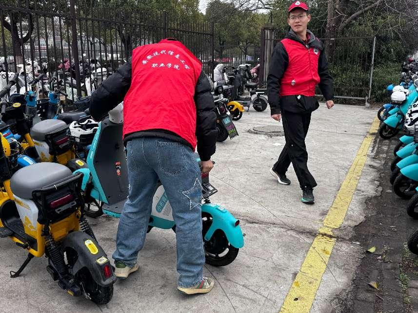 劝导员们秉持着高度的责任感,于既定时间准时抵达各自所负责的路口。一到现场,他们便迅速投入到工作之中。目光首先聚焦在学院大门口那一片停放杂乱的共享单车区域,只见他们有条不紊地将一辆辆单车搬起,轻放在规定的停放位置,动作娴熟且利落,原本东倒西歪的共享单车便排列得整整齐齐,宛如接受检阅的士兵,为学院门口增添了一份秩序之美。