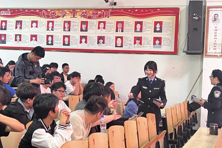 吴启贤警官则聚焦于反诈安全领域。在如今这个网络高度发达的时代,诈骗手段层出不穷,让人防不胜防。吴启贤警官详细剖析了常见的诈骗类型,如电信诈骗、网络刷单诈骗、交友诈骗等,逐一拆解诈骗分子的惯用套路。同时,她还播放了精心挑选的反诈视频,视频中的受害者因为一时疏忽,落入诈骗陷阱,遭受财产损失,甚至精神创伤,这些真实的遭遇深深触动了在场的每一位同学。同学们在学习到甄别诈骗陷阱方法的同时,内心的反诈警钟也被重重敲响。