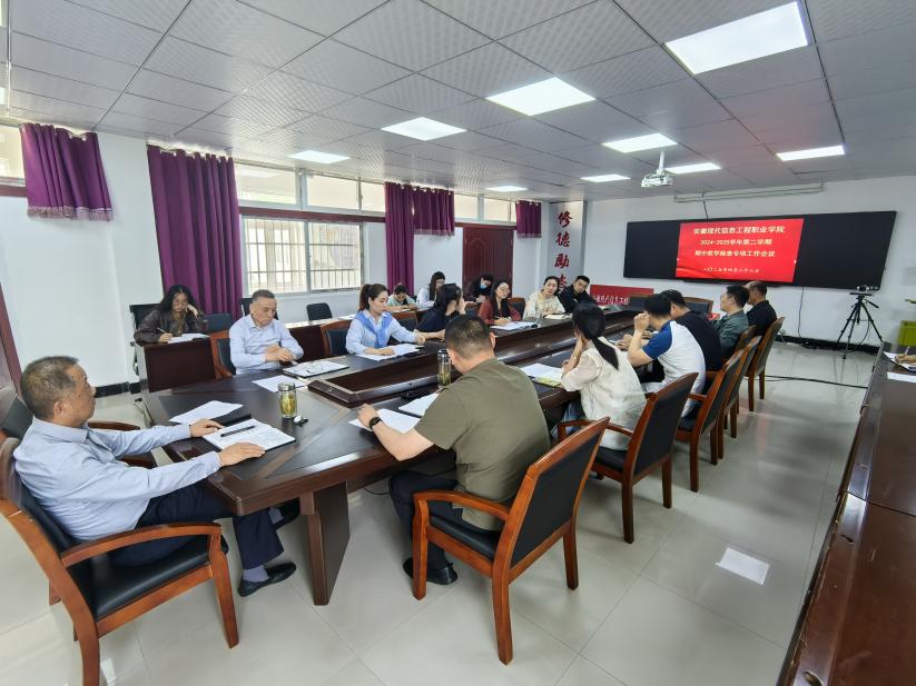 2025年4月28日下午,在行政楼二楼会议室召开了 2024 - 2025 学年第二学期期中教学检查专项工作会议,会议旨在明确期中检查任务和要求。党委副书记、院长肖成兵,党委委员、副院长李阳,教学总督导蔡泉,教务处处长刘敏,各系部主任及教学秘书等人员参加了此次会议。