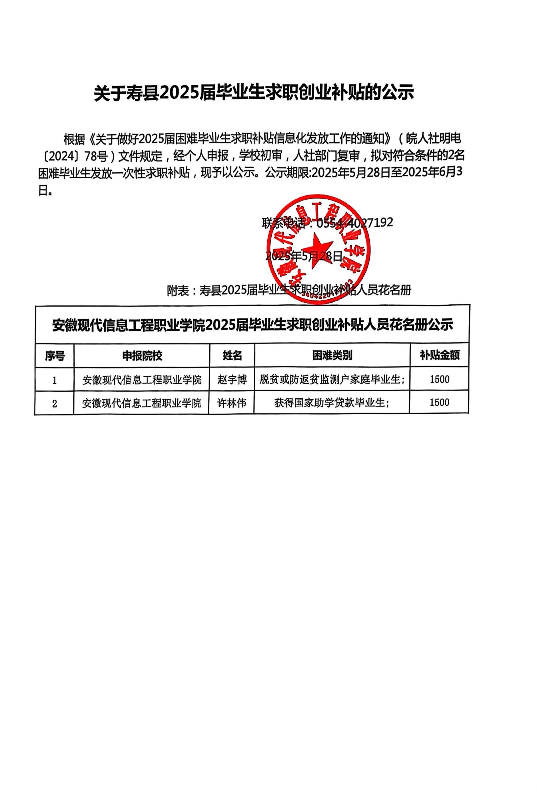 关于寿县2025届毕业生求职创业补贴的公示