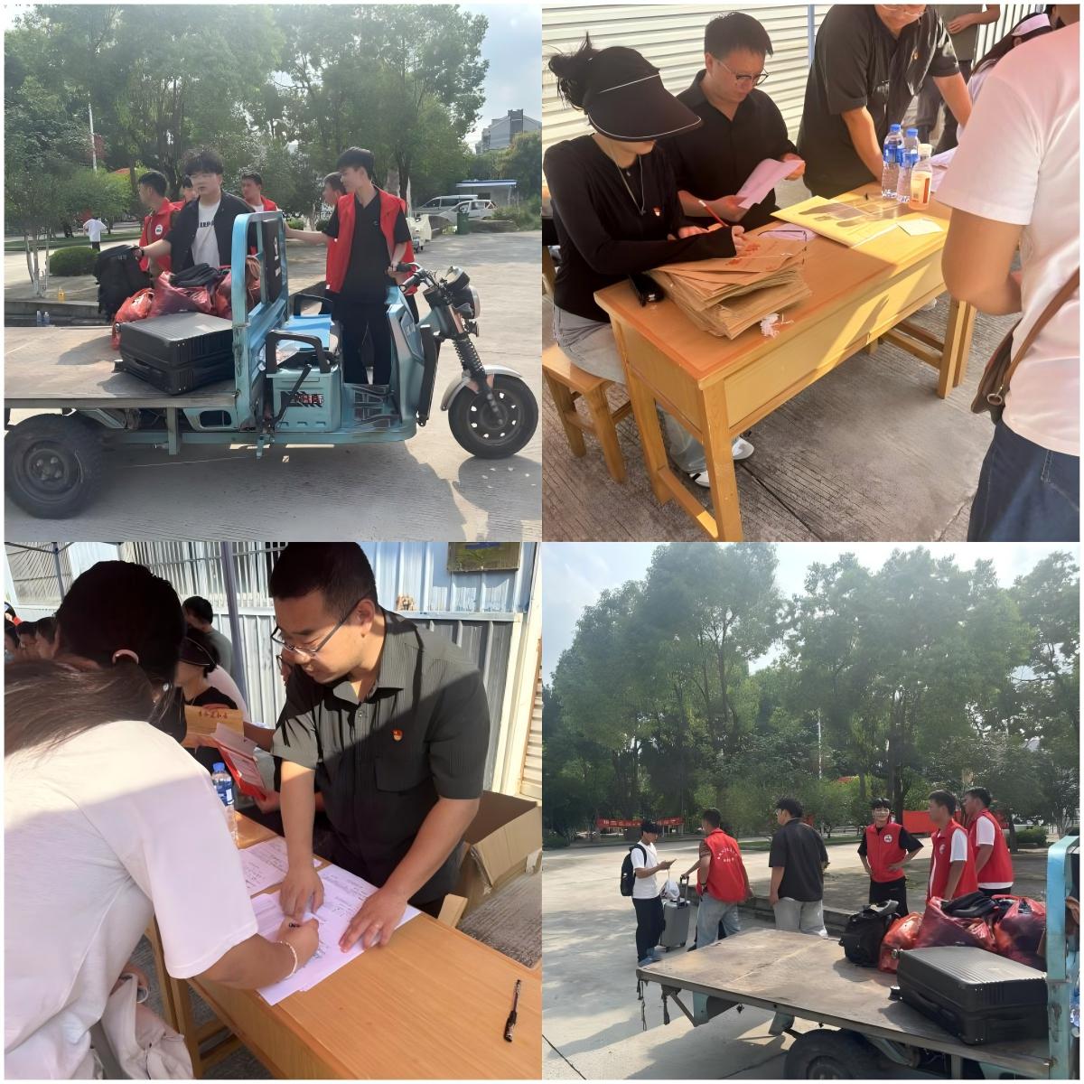 迎新日当天,校园内人头攒动,气氛热烈。机电经管系党支部的师生党员们统一佩戴党徽和志愿服务标识,精神饱满地投入到各自岗位中,成为迎新现场一道亮丽的风景线。首先,耐心细致引导咨询,在校门口、报到处、宿舍楼等关键点位,李阳院长,江倩主任,张克学主任主动迎上前,耐心解答新生及家长关于报到流程、校园布局、专业学习、生活设施等方面的疑问,提供清晰准确的指引,有效缓解了新生初入校园的迷茫与不安。接着,行李搬运,挥洒汗水。面对新生繁多的行李,张克学主任带领团员学生们不辞辛劳,肩扛手提,穿梭于迎新报到点和学生公寓之间,用实实在在的行动为新生减轻负担,传递出机电经管系大家庭的第一份温暖与力量。再次,手续办理,高效有序。在报到注册点,顾祝正,蔡珂玥,孙林涛三位老师们协助辅导员和财务处老师,认真细致地核对信息、收集材料、办理手续,维持现场秩序,大大提高了报到效率,确保了迎新工作的顺畅运行。