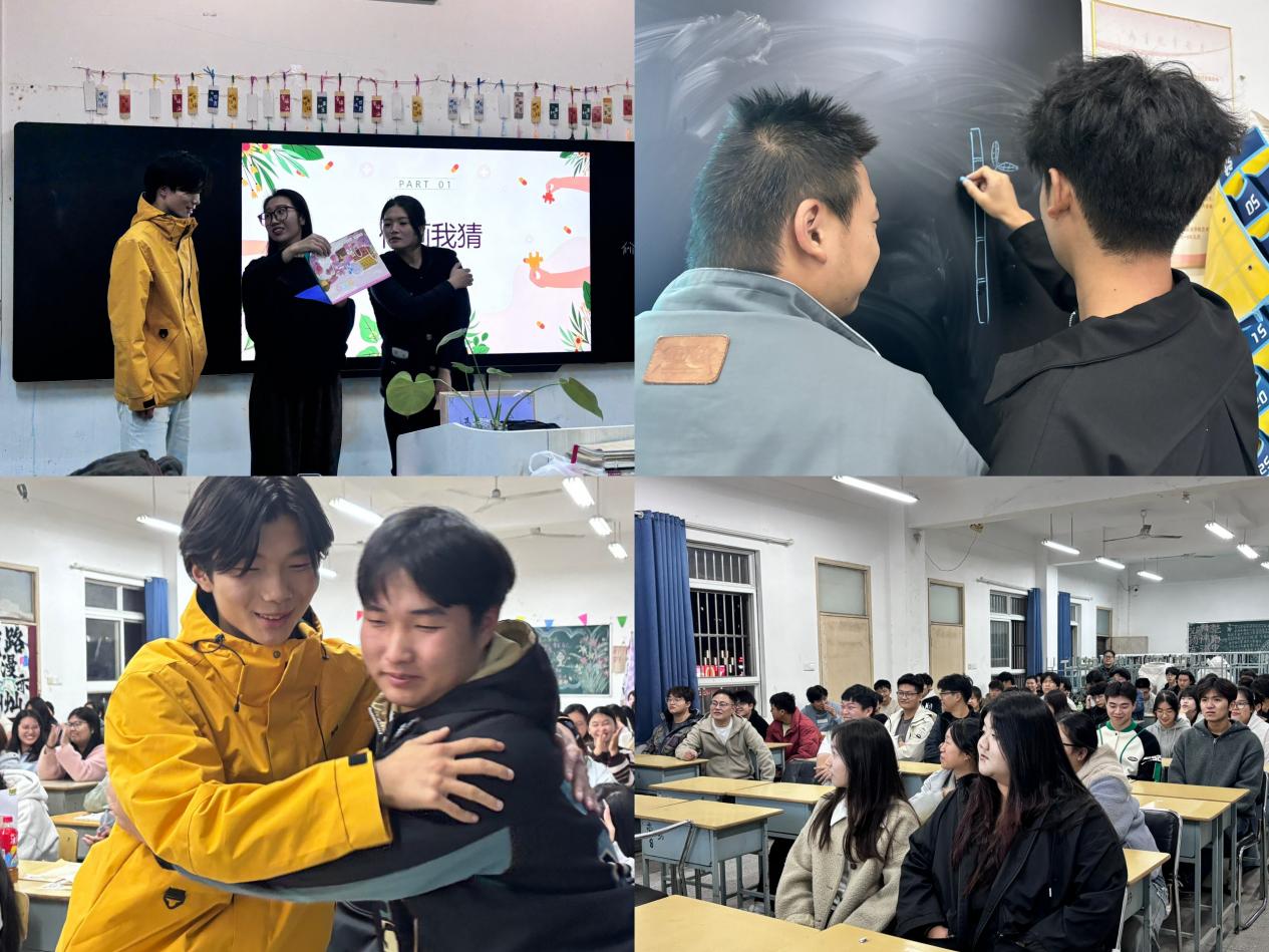 首个“你画我猜”环节迅速点燃现场氛围。3509教室的建筑工程管理专业的同学用简约笔触呈现,3507教室艺术传媒专业学子则发挥专业特长,围绕“情绪词”、“成语典故”等题目,用流畅线条勾勒出每个词的具象,搭档们默契十足,几秒内便能猜对答案。活动中,猜错时的调侃、猜对后的拥抱,让整个教室充满活力。