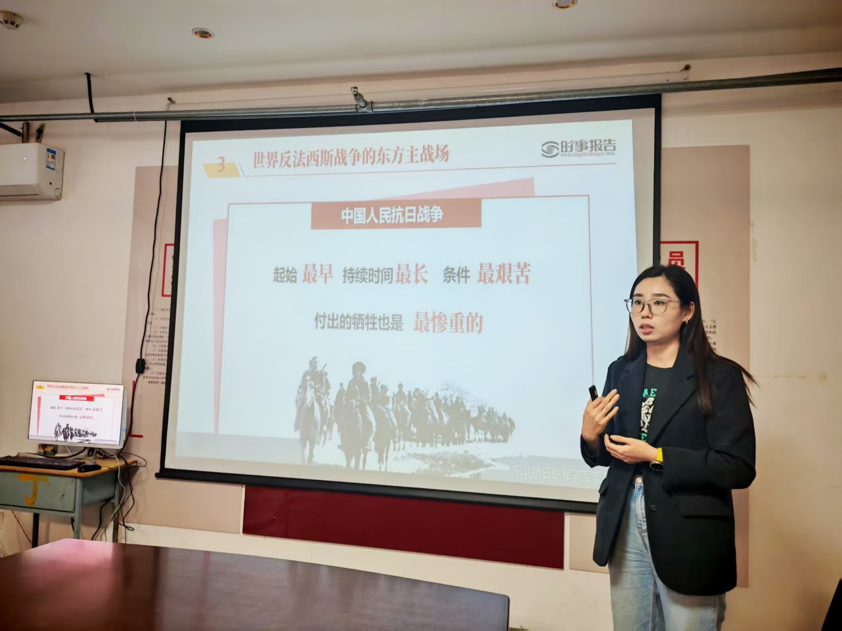 党课上,刘敏书记系统回顾了十四年抗战历程。她指出,从局部抗战到全民族抗战,中国共产党是抗日战争的中流砥柱:不仅促成并维护了抗日民族统一战线,更通过《论持久战》提供了战略指导。她结合正面战场与敌后战场的重要战役,强调百团大战等军事行动展现了中国人民不屈的抗战意志,印证了党的正确领导是胜利的根本保证。刘敏书记引用习近平总书记的重要论述,强调中国作为东方主战场,在抗战中付出巨大牺牲、作出卓越贡献,其胜利既是中华民族从危机走向复兴的历史转折,也是世界反法西斯战争的重要组成部分。