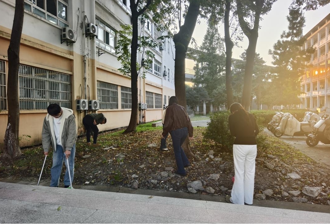 党员们按小组分工迅速投入垃圾捡拾工作。大家手持清洁工具,弯腰俯身清理路面及周边的塑料袋、饮料瓶、烟头、纸屑等各类垃圾,对隐蔽角落的废弃物也逐一排查、细致清理。大家分工协作、相互配合,不怕脏、不怕累,以实际行动践行环保理念。支部宣传小组全程跟踪拍摄,记录下党员志愿服务的鲜活瞬间,同时向过往师生宣传环保知识,呼吁大家共同守护校园环境。后勤保障小组巡回巡查,及时提供饮用水补给,做好安全保障与应急准备,确保活动有序推进。