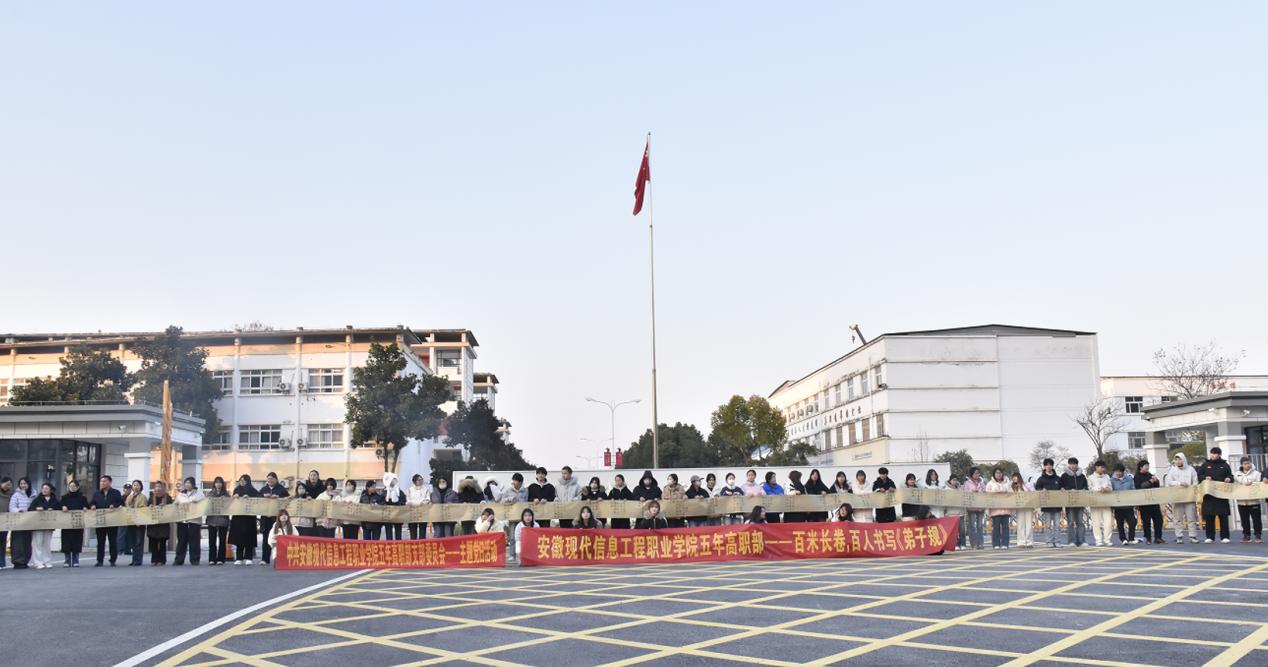 2025年12月25日16时,由学院五年高职部系部主任庄雪芹牵头统筹,副主任李远萍、吴跃婷全程协调组织的“百米长卷·百人书写《弟子规》”活动正式启幕。学院执行董事曹学华亲临现场,财务处处长冯润生、党委统宣统部刘家龄、教师洪训谊、教师戚明扬受邀出席,部门全体教师与学生代表共同参与,共赴这场传统文化盛宴。