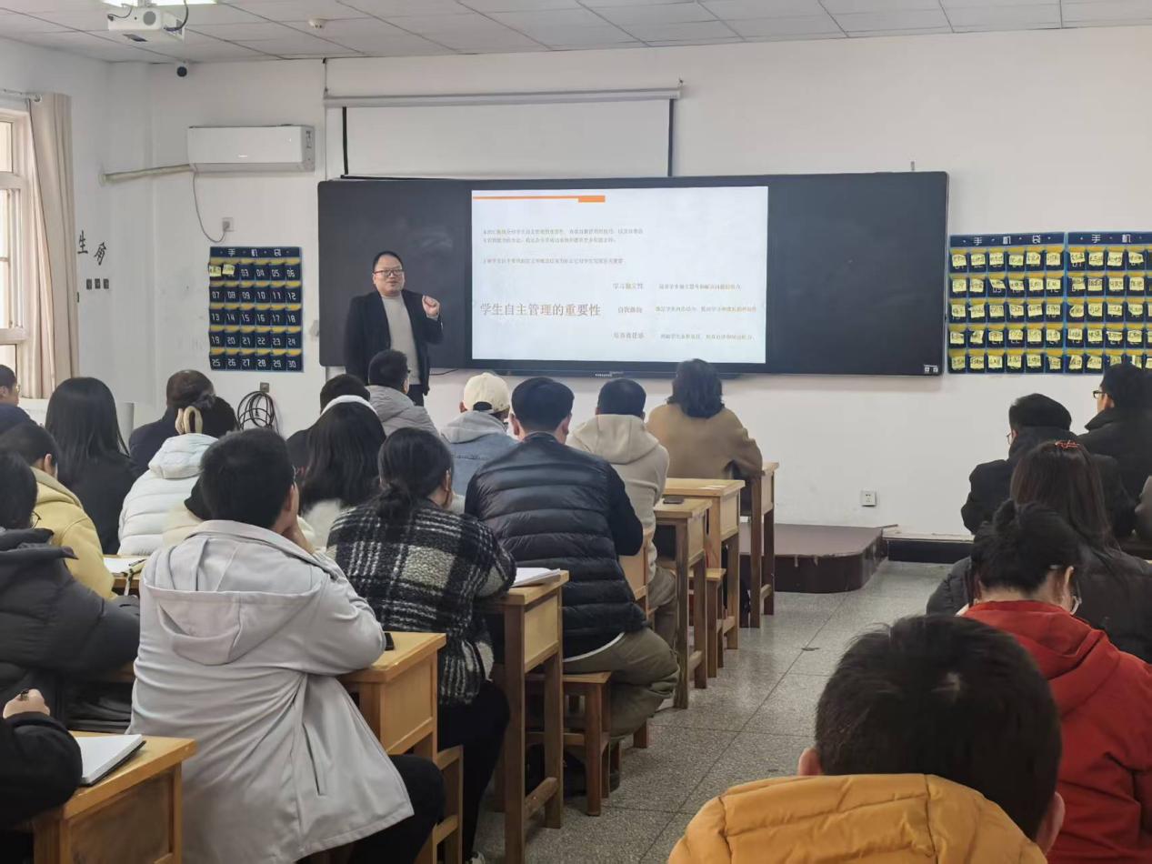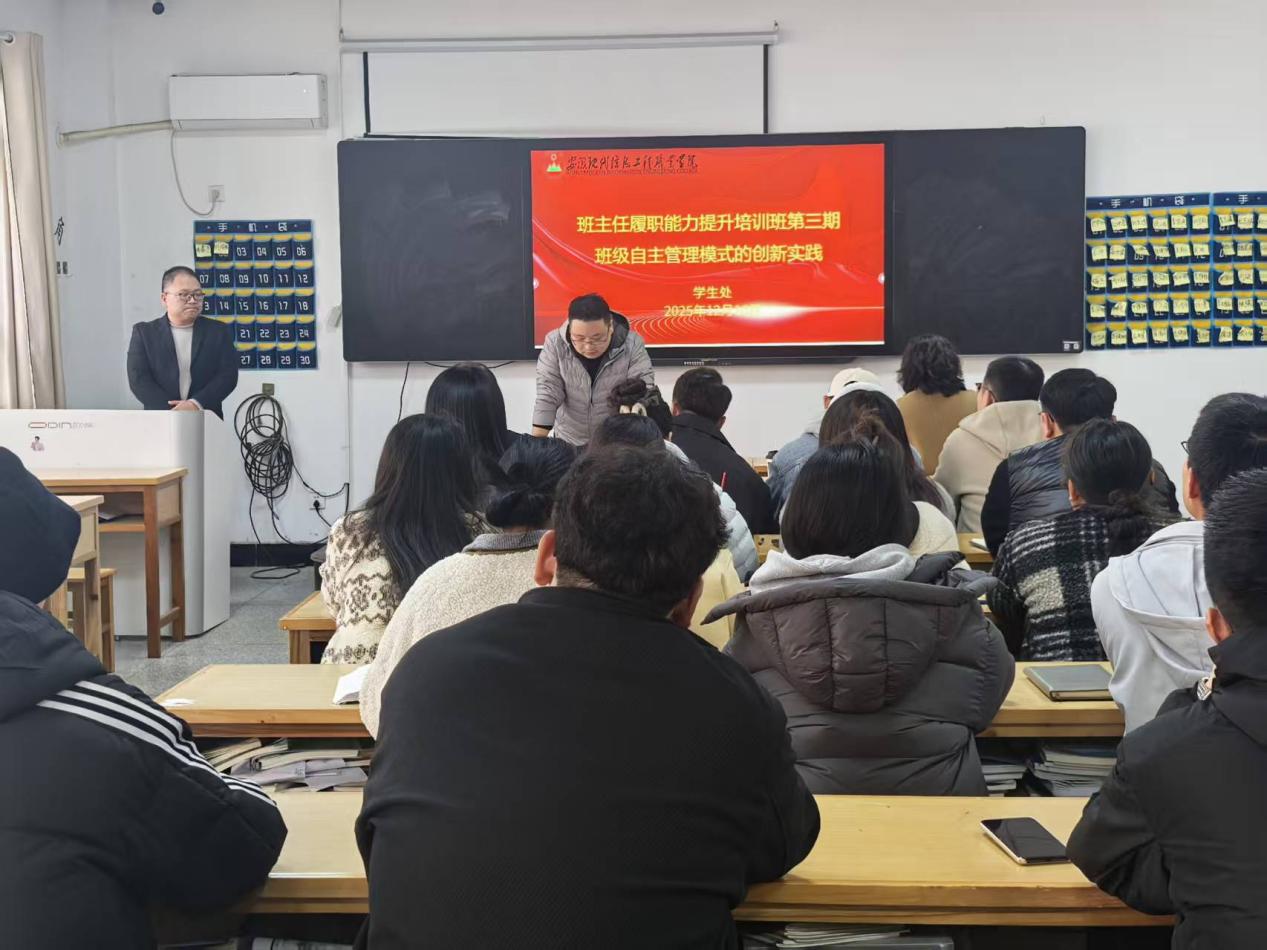 2025年12月10日下午,第三期辅导员履职能力提升培训暨十二月辅导员例会——班级自主管理模式的创新实践,在学院教学楼1204教室召开。学生处处长戴文俊、副处长杨永梅、各系部主任及全体辅导员参会,邀请淮南师范学院机械与电气工程学院团委书记王孟军老师作辅导报告,会议由处长戴文俊主持。