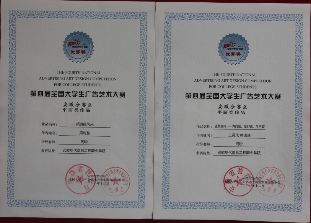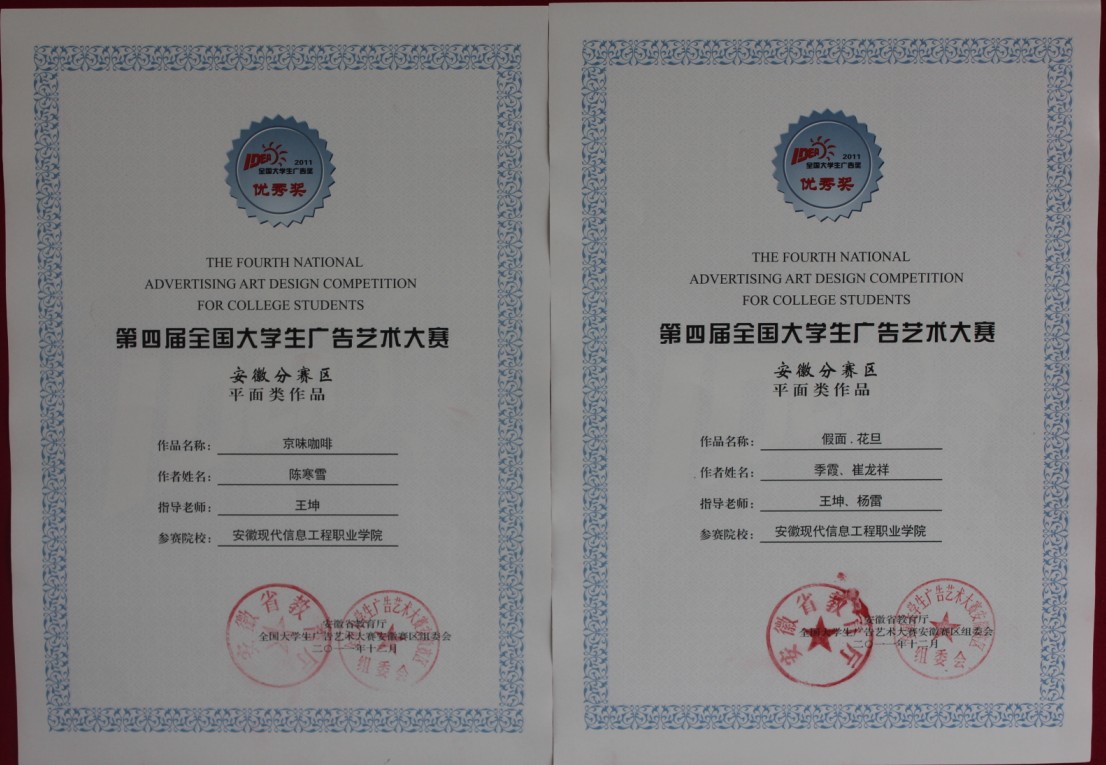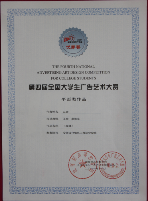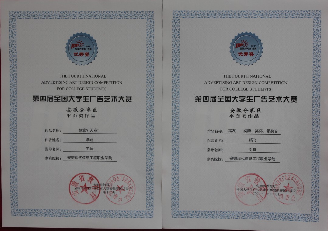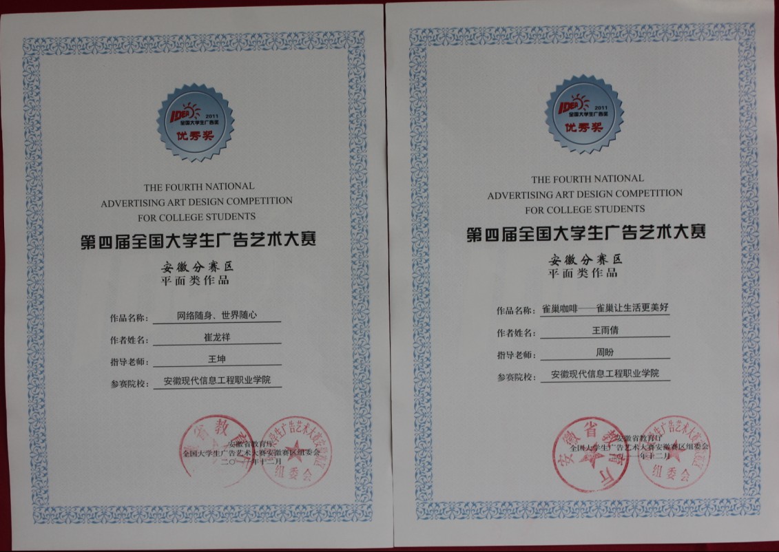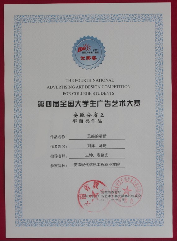 第四届全国大学生广告艺术大赛评审结果揭晓,我系选送的参赛作品喜获佳绩,共有16件作品获奖,其中全国优秀奖1项,安徽省赛区二等奖3项、三等奖1项、优秀奖11项,可谓是硕果累累,惊喜连连。