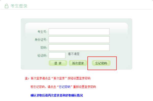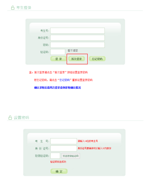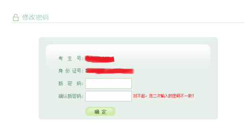 输入考生号,身份证号,点击“发送短信验证码”按钮后,系统会随机发送6位数字验证码至考生报名时所填的手机号上;填写完短信验证码,点击“确定”,跳转至考生修改密码页面,设置考生登录密码。短信验证码只能发送5次,请考生谨慎操作。