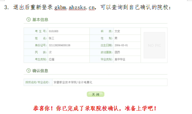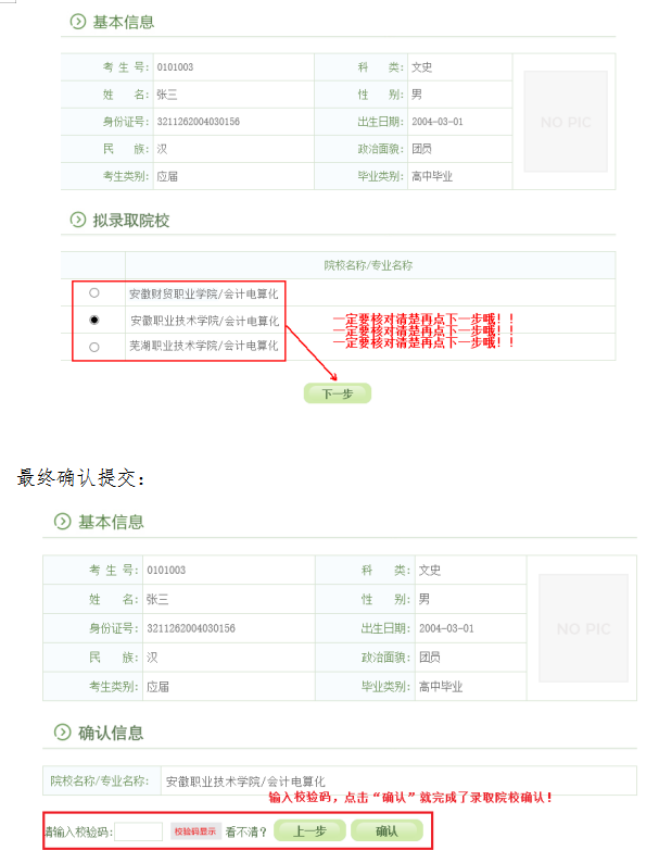 特别提醒:高职扩招录取确认只有在规定时间内(8月26日-27日),在规定网站(gkbm.ahzsks.cn)上操作方为有效。请各位考生一定要妥善保管自己的考生号、身份证号等个人信息,切勿泄露给其他人,更不要委托他人代替自己确认。一旦确认了录取院校,是不能修改的!!!
