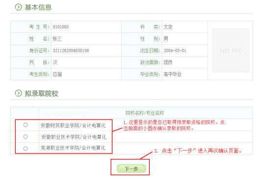 特别提醒:高职扩招录取确认只有在规定时间内(8月26日-27日),在规定网站(gkbm.ahzsks.cn)上操作方为有效。请各位考生一定要妥善保管自己的考生号、身份证号等个人信息,切勿泄露给其他人,更不要委托他人代替自己确认。一旦确认了录取院校,是不能修改的!!!