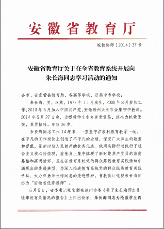 安徽省教育厅关于在全省教育系统开展向朱长海同志学习活动的通知