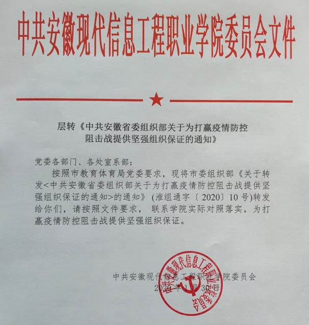层转《中共安徽省委组织部关于为打赢疫情防控阻击战提供坚强组织保证的通知》