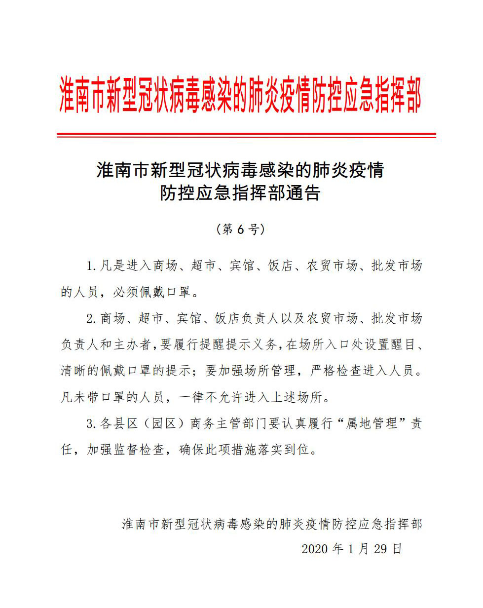 淮南市新型冠状病毒感染的肺炎疫情防控应急指挥部通告