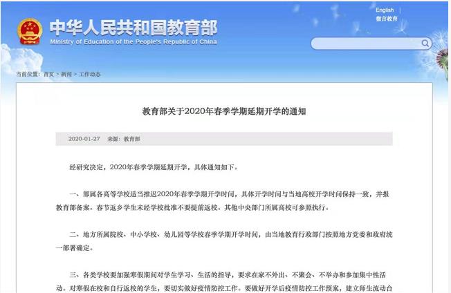 经研究决定,2020年春季学期延期开学,具体通知如下。