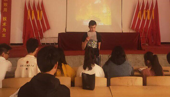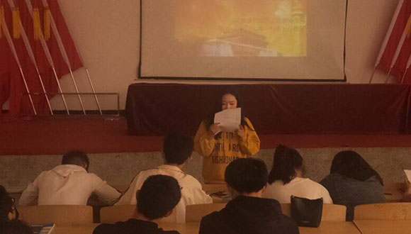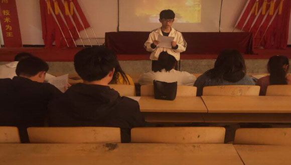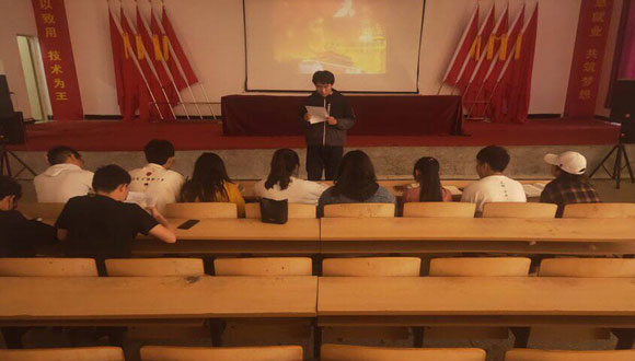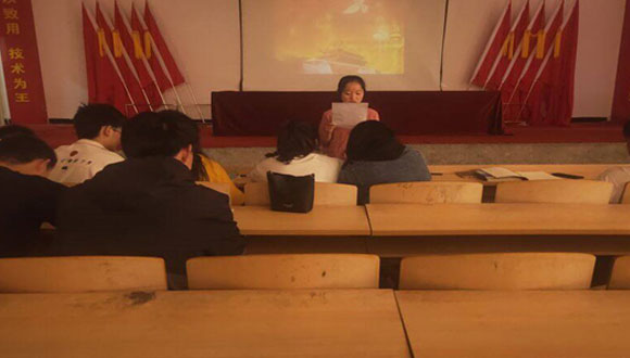 当日中午,院团委学生会组织部分学生干部以及优秀学生青年在多功能报告厅召开五四会议。随后,全体同学面对鲜艳的团旗、团徽、庄严地举起右手,整齐而洪亮地宣读着入团誓词。雄壮的宣誓声,在会场里久久回荡,一颗颗年轻的心里,流淌着为共产主义奋斗终身的热血,整个过程,同学们激情奔放,在校园内掀起一阵爱国浪潮。