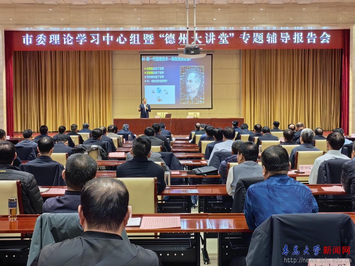 会谈交流后,魏志强围绕“新质生产力助力先进制造业强市建设”这一主题,以《AI如何赋能先进制造业?电子信息材料等场景驱动的若干AI问题》为题,在德州市委理论学习中心组暨“德州大讲堂”作了专题辅导报告。