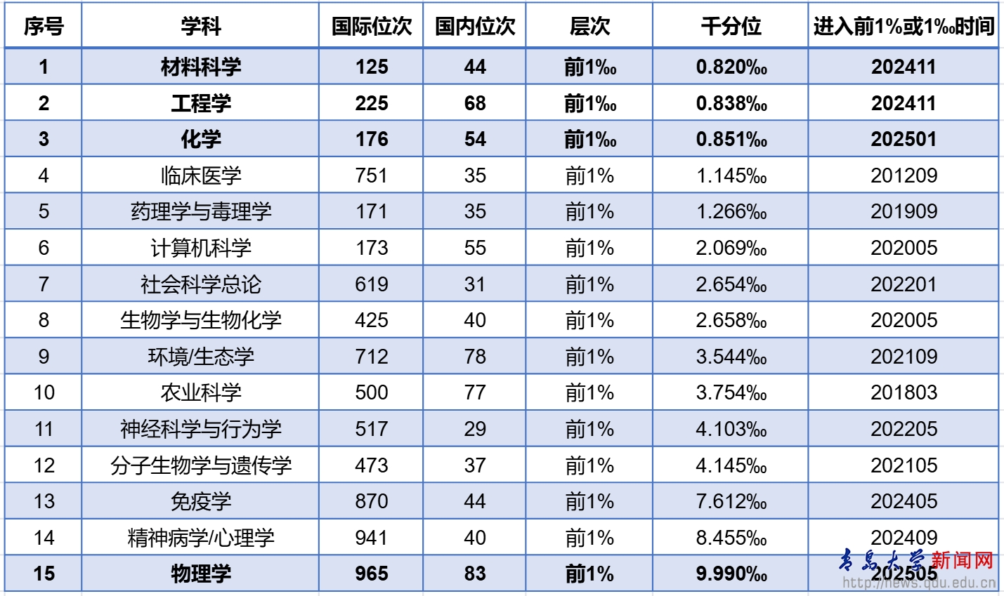 除物理学外,其他上榜学科中,材料科学(0.82‰)、工程学(0.84‰)、化学(0.85‰)位居全球排名前1‰;临床医学(1.15‰)、药理学与毒理学(1.27‰)位居全球前2‰;计算机科学(2.07‰)、社会科学(2.66‰)、生物及生物化学(2.66‰)位居全球前3‰;环境学及生态学(3.54‰)、农业科学(3.75‰)、神经科学与行为科学(4.10‰)、分子生物学与遗传学(4.15‰)位居全球前5‰;免疫学(7.61‰)、心理学与精神病学(8.46‰)位居全球前1%。