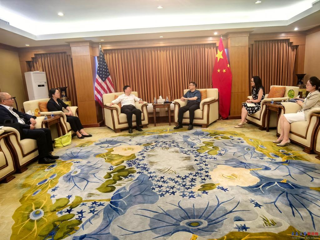 在中国驻洛杉矶总领事馆,总领事馆教育参赞黄伟等接待了代表团一行。黄伟介绍了洛杉矶领区内的高等教育基本情况,并针对PA视讯实际情况提出了对美交流建议。双方就优化交流美国高校布局以及青年使者交流学习计划(YES项目)等进行了深入交流。