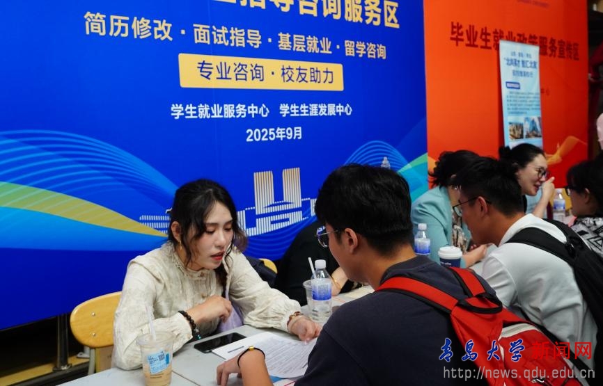 本次双选会特别设置了多个功能区,为毕业生提供“一站式”综合服务。现场不仅设有崂山、淄博、威海等地市招聘专区,更汇聚了政策咨询、职业指导与征兵宣传三大服务平台:多地人社部门现场解读落户、档案等政策,释放引才红利;校内外专家坐镇,提供“一对一”简历修改与职业规划;征兵宣讲则鼓励毕业生投身国防,实现人生价值。