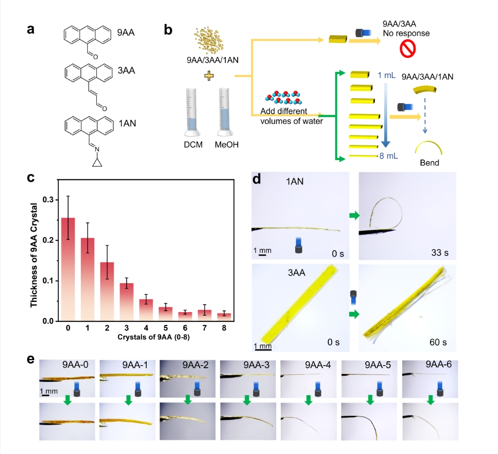 刺激响应晶体作为一类新型智能材料,在诸如光、热、机械力等外界刺激下能够发生显著的理化性质变化。其中,光机械响应晶体具备将光能直接转化为多种机械形变与运动的能力,并在软体机器人、致动器及仿生运动等领域具有重要的潜力应用。然而,该研究领域依然面临调控结晶过程困难、晶体生长尺寸对材料形变影响机制不清晰,以及响应过程如何保持结构完整性等诸多关键科学问题。本研究团工作利用水辅助沉淀法,室温下制备出厚度可控的蒽衍生物晶体,在光照条件下通过[4+4]环加成反应诱发晶体弯曲和分裂的光机械响应行为,赋予了材料连续向光、背光弯曲、撕裂成晶体纤维等特性,并对其运动的幅度、方向和类型进行精确控制,初步探索了光机械响应晶体在模拟类人运动微型机器人方面的应用等。